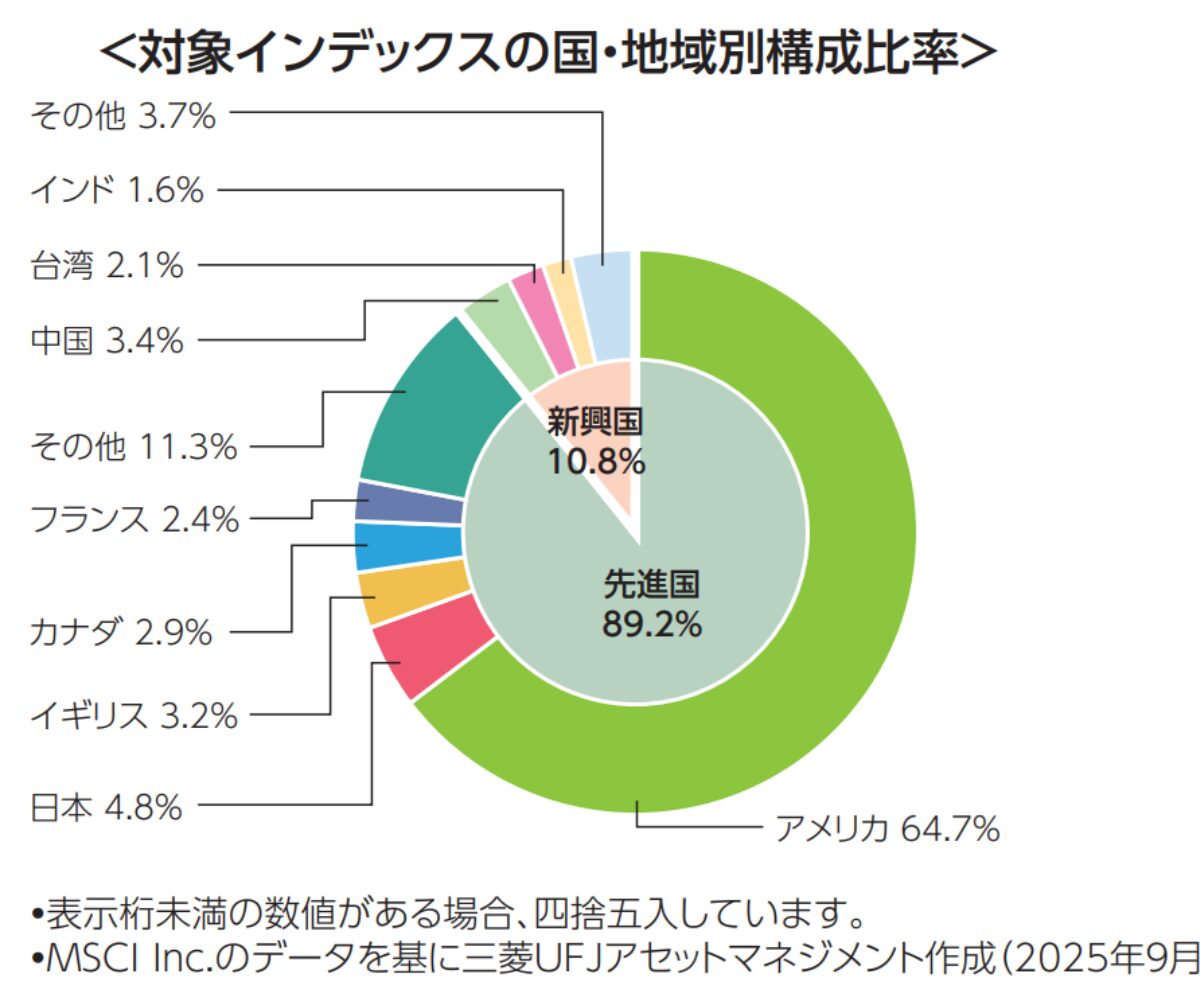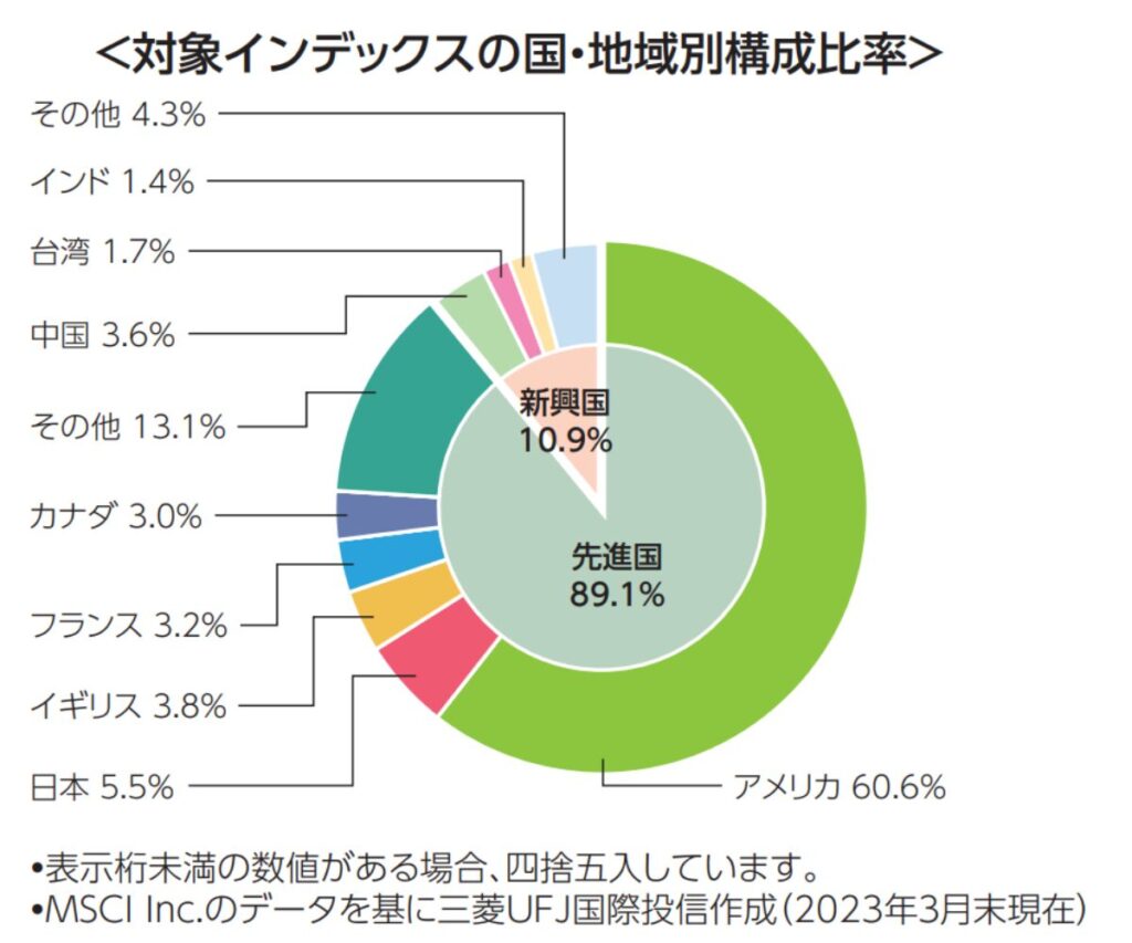 世界の約2500社の優良企業の株をバランス良く組み合わせた商品。世界中の株式市場の約85%をカバーしており、国別比率、業界業種比率も実体経済に近い構成比率となっています。強いて挙げれば中国と日本の比率がやや低い感じがしますが、将来の人口減少を加味すると理にかなった比率と言えます。
